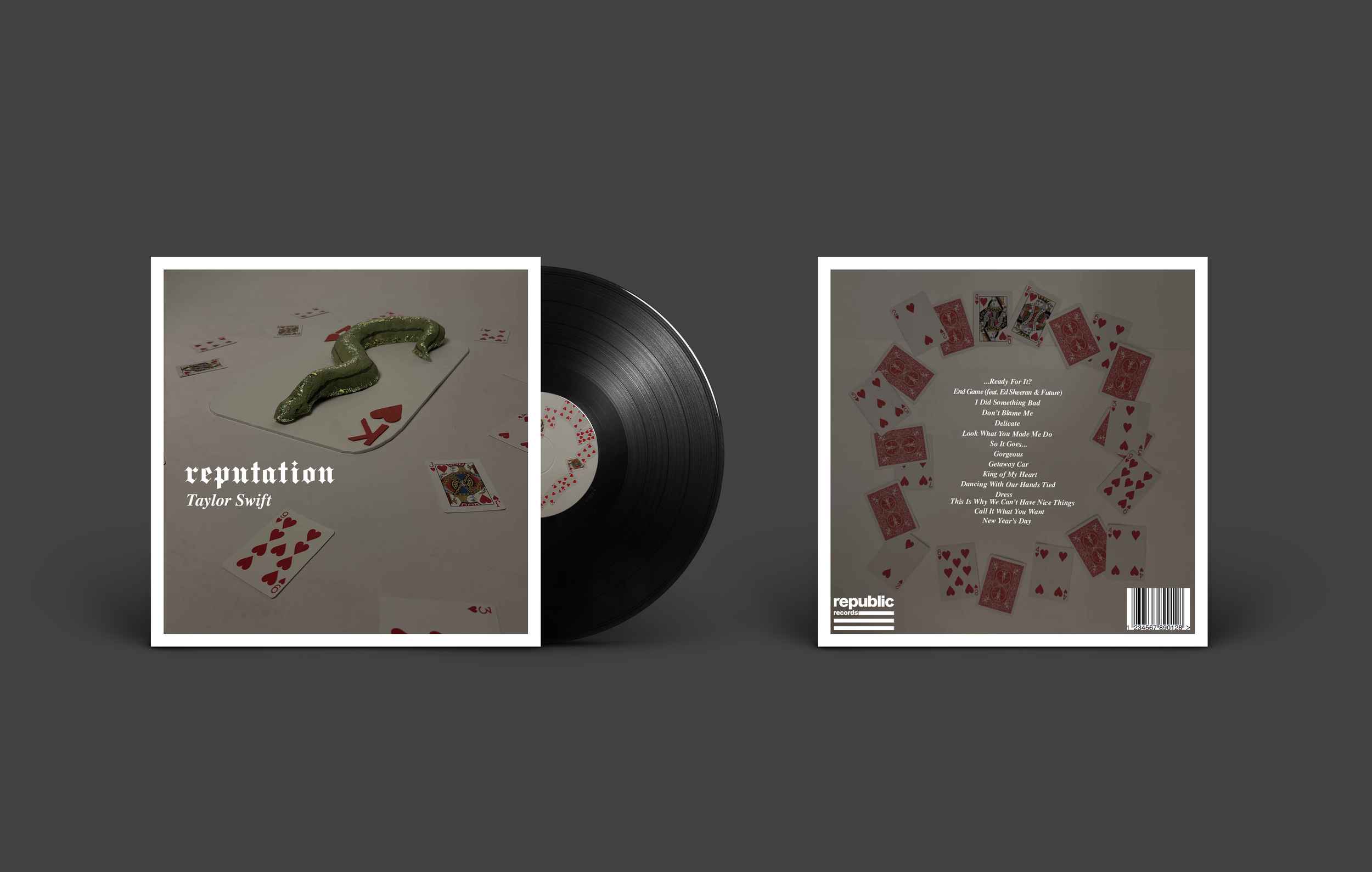 Handmade album cover for Taylor Swift’s studio album, “reputation.” The album has themes of finding love in the darkest times, and I wanted to highlight that. Another big visual of the album is snakes, and that was a must-include.